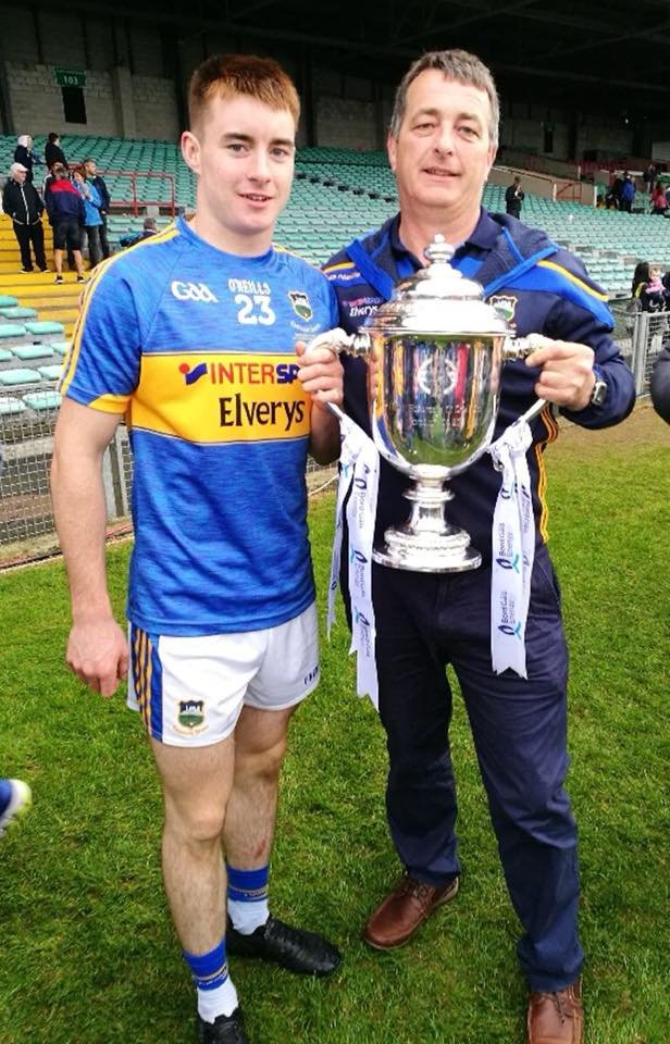 Cian Flanagan and his father James with the Nowlan Cup after the All Ireland U21 H Final 2018